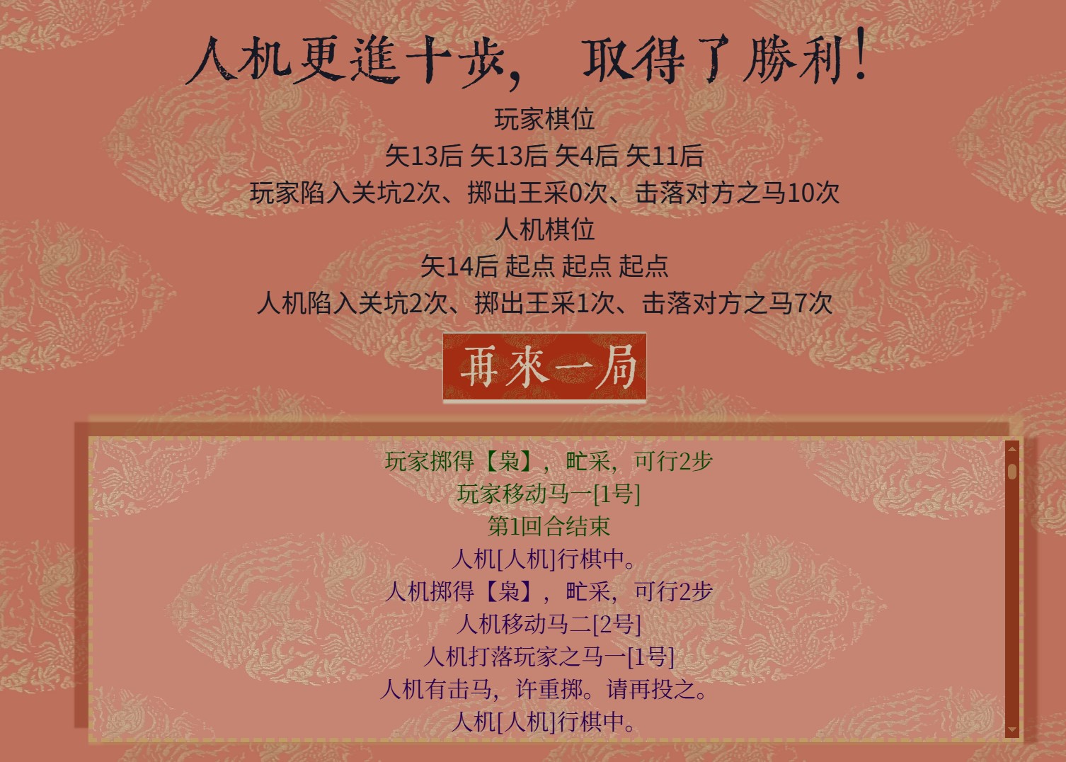 也希望能自動下棋,例如只剩一馬能走或者零馬能走的時候,可以不用按,自動過。中期四馬卡坑、後期兩三馬達陣,這種情況都挺常見。