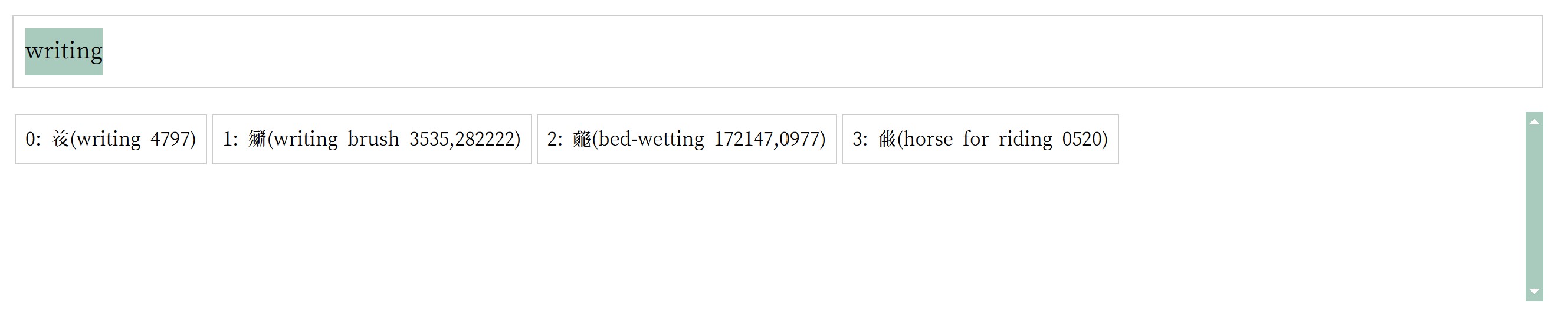 - Handwriting mode. Use the brush to draw, or paste/upload/take a photo. Click the search button to get results. Currently, it doesn't work with real-world non-square pictures of characters with thin strokes. (Recognition is deployed on Hugging Face.)